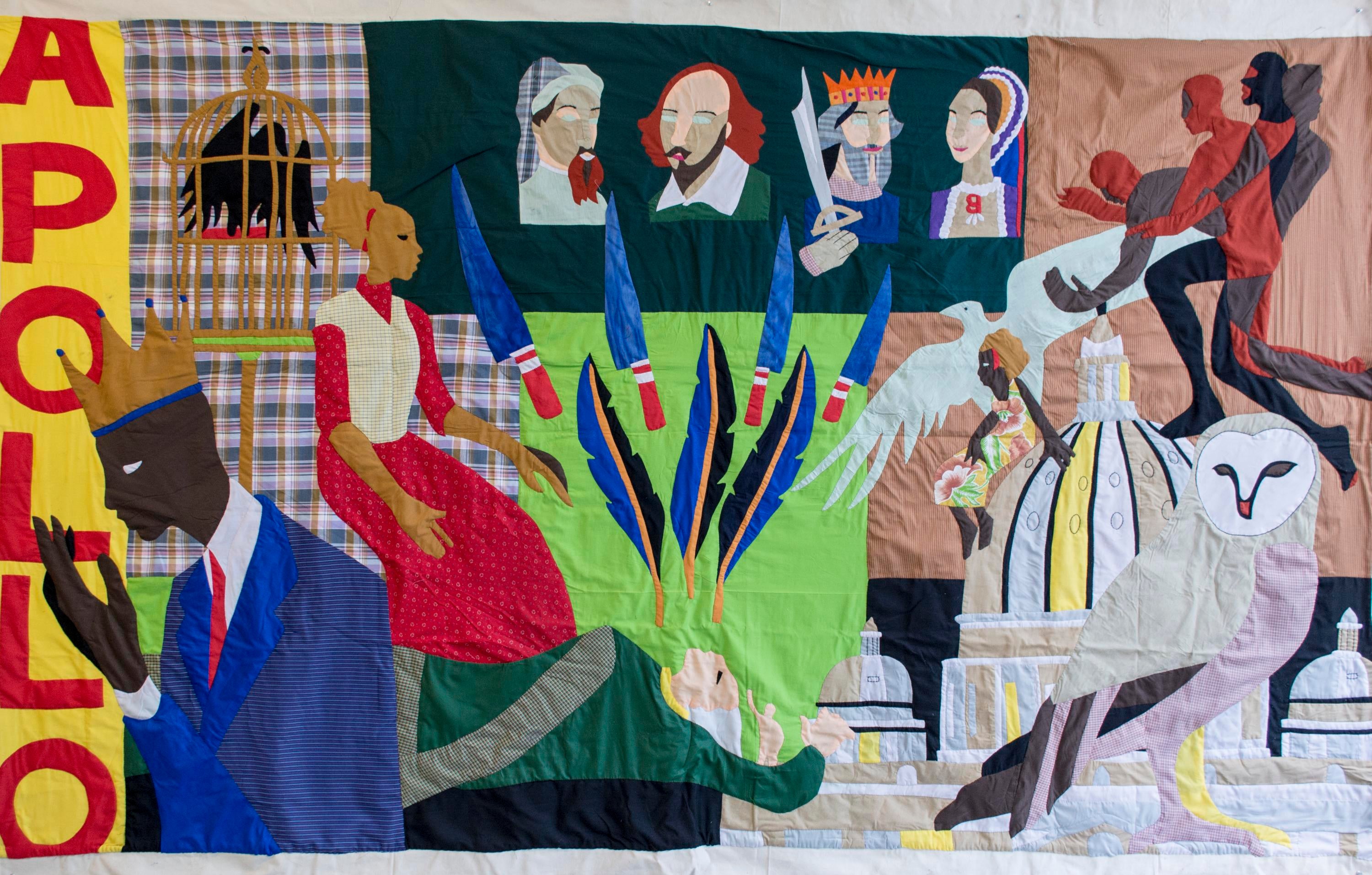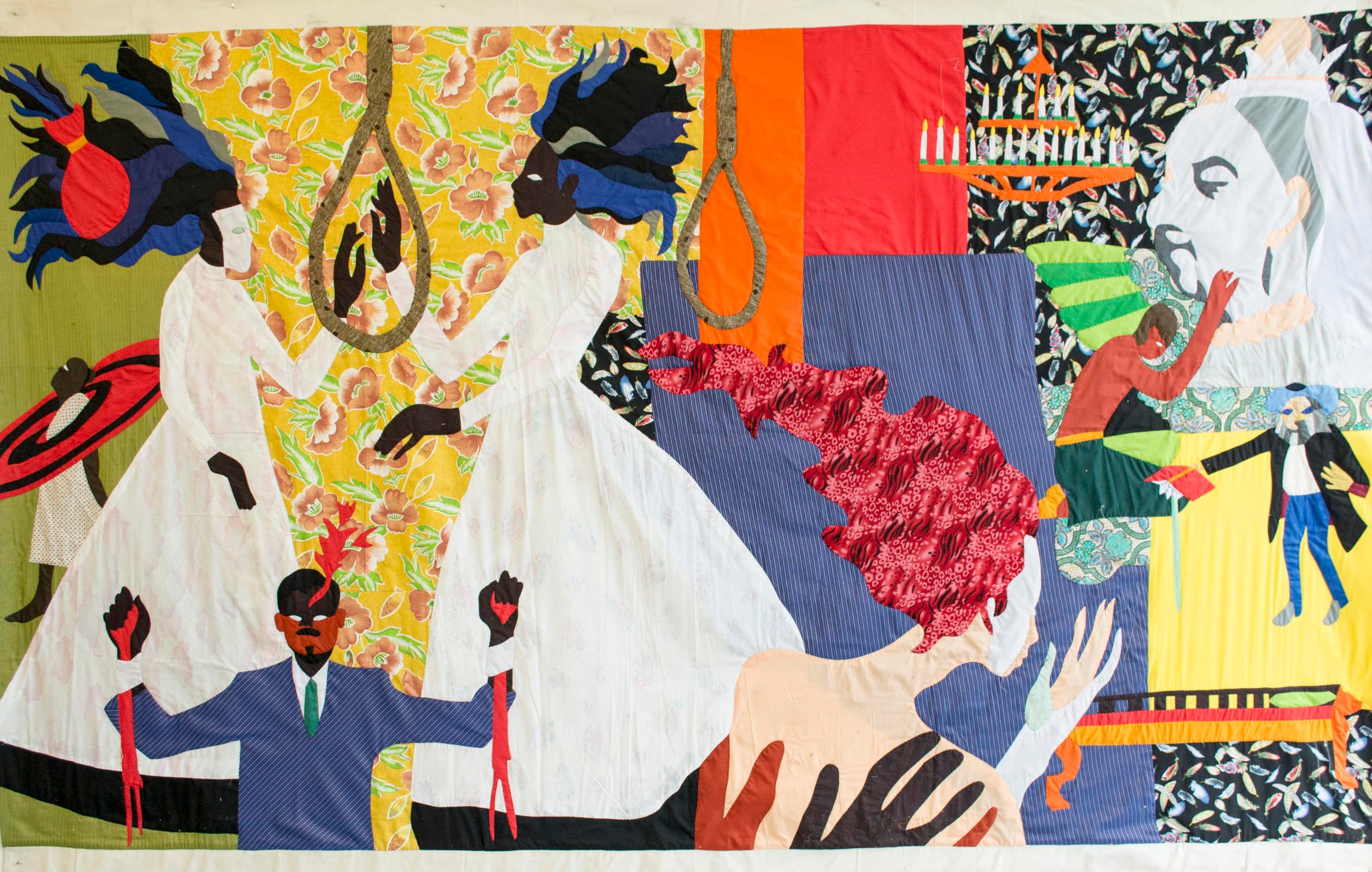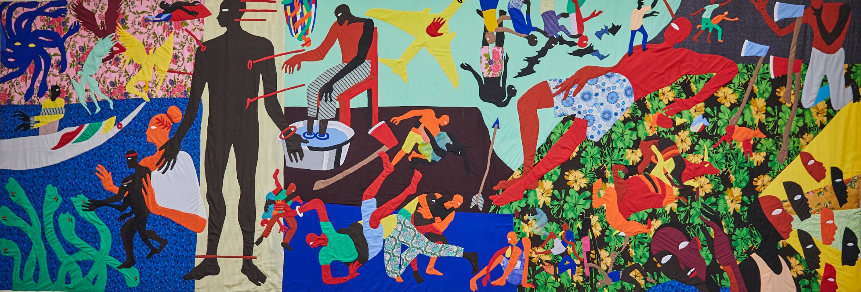 El trabajo del artista y escritor estadounidense Christopher Myers se centra en la narración a través de diversas culturas. En su producción, que abarca textiles, arte de acción y escultura, colabora con artistas de distintas partes del mundo y descompone mitologías e historias no escritas propias de los pueblos y lugares en los que trabaja. Entre sus obras más reconocidas se encuentran los monumentales tapices de apliques, donde fusiona tradiciones culturales y visuales de África, Europa y América. Su empleo del aplique, una técnica de bordado en la que se cosen piezas de tela de distintas formas para componer una imagen mayor, resalta el carácter artesanal e íntimo de su práctica. Cada fragmento de tela que Myers cose posee su propia historia, desde encaje de boda nigeriano hasta algodón vietnamita, lo que evidencia los registros de movimiento, migración e intercambio que constituyen el núcleo de su obra.