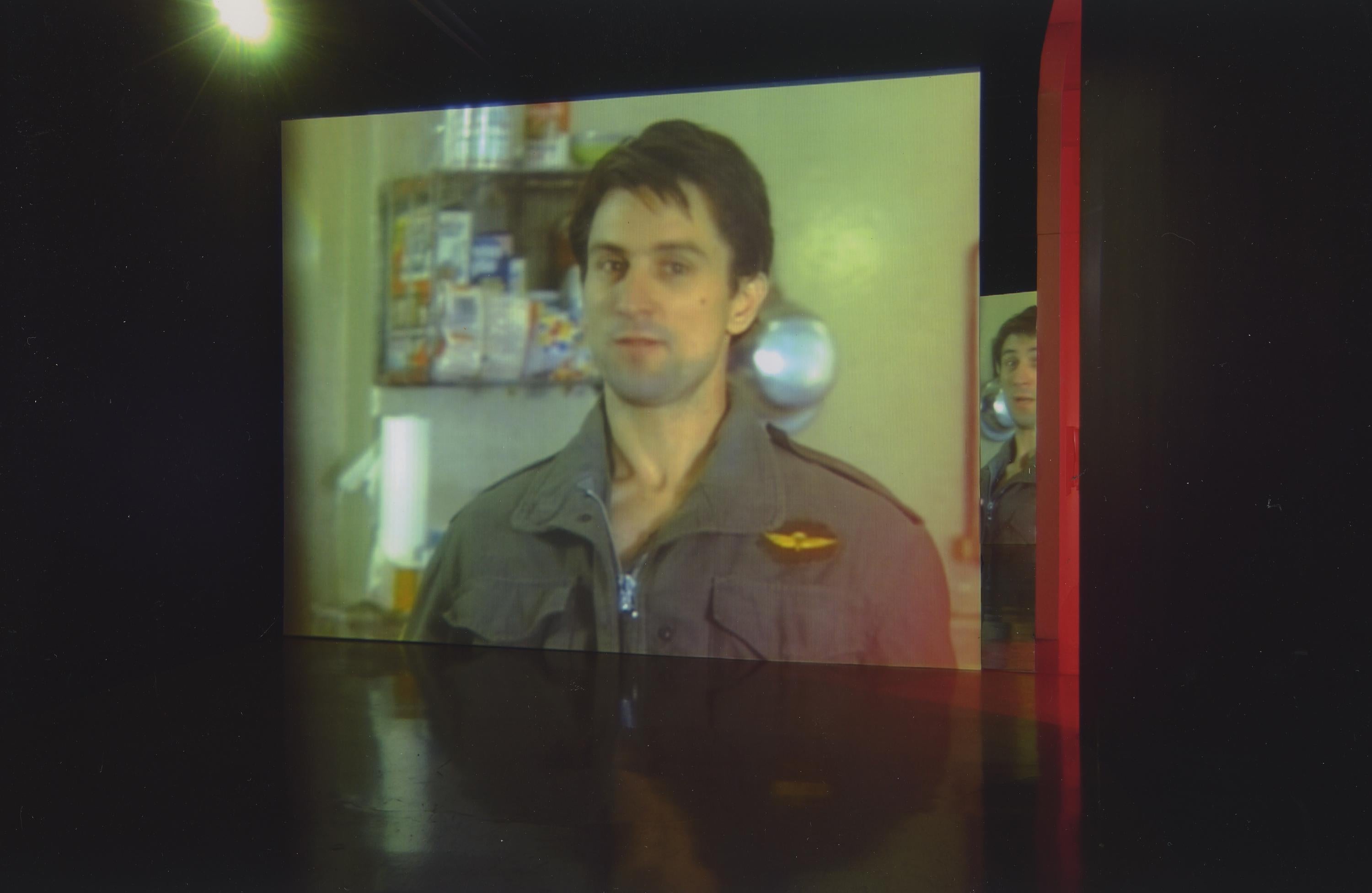 Douglas Gordon es un artista escocés cuya práctica ecléctica incluye obras en video, fotografía, texto y escultura. Es conocido por su uso de material encontrado, especialmente del cine de Hollywood, y su exploración de la memoria, la identidad, la dualidad y el tiempo. Por lo general, manipula el metraje de la película, alargando su duración o yuxtaponiendo imágenes para desafiar la comprensión común de las películas. En su obra Through a Looking Glass [A través de un espejo], 1999, Gordon extrae un monólogo de la película Taxi Driver de 1976 de Martin Scorsese, en la que el personaje principal se dirige a la cámara. Al proyectar la misma escena en dos pantallas reflejadas, los dos clips se desincronizan rápidamente, lo que crea un diálogo visual y sonoro frenético. Como un vuelco a las formas tradicionales de consumir cine, Gordon altera el sentido lineal de la narrativa y el tiempo de los espectadores.