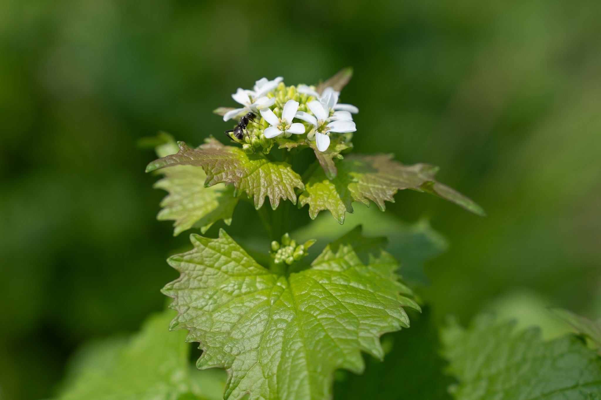 La mostaza de ajo es una planta invasora de Europa y Asia, y es una plaga paisajística en los bosques de la región del Atlántico medio (y en todo el este de América del Norte). Aunque inicialmente se introdujo por sus cualidades herbales y medicinales, se extendió rápidamente debido a la falta de depredadores naturales. Sus hojas tienen un olor a ajo cuando se trituran, lo que le da su nombre común. Las plantas de primer año se caracterizan por hojas de bajo crecimiento, mientras que las plantas de segundo año muestran forma de "perno", creciendo hasta 3 pies de altura y cubiertas con flores blancas de cuatro pétalos. La planta se controla más fácilmente tirando: la raíz principal no vuelve a crecer cuando se rompe. Debe arrancarse antes de que se desarrollen las semillas. Es visible en todo el paisaje boscoso en Glenstone, aunque el equipo de jardinería realiza trabajos estacionales para retirar poblaciones prominentes.