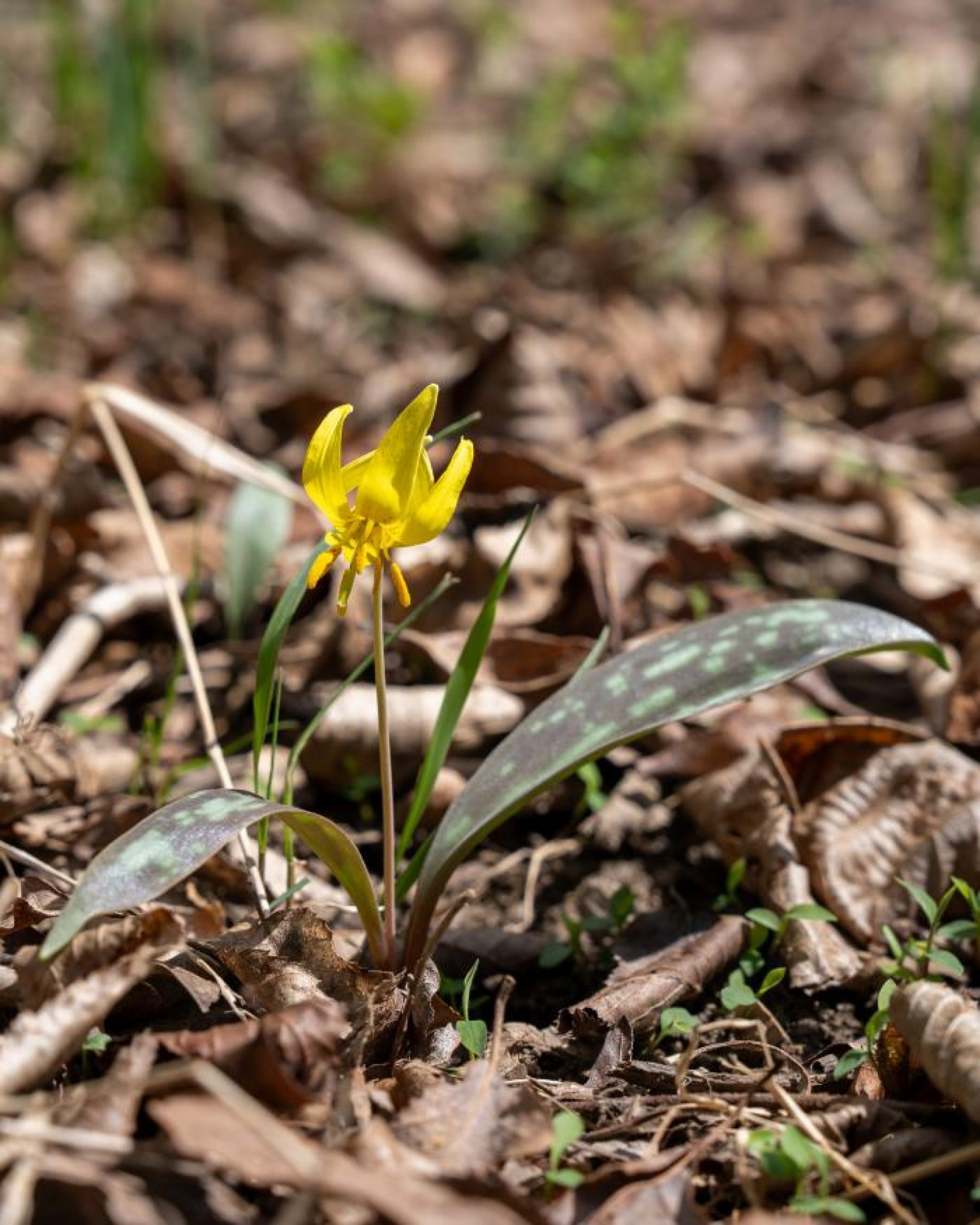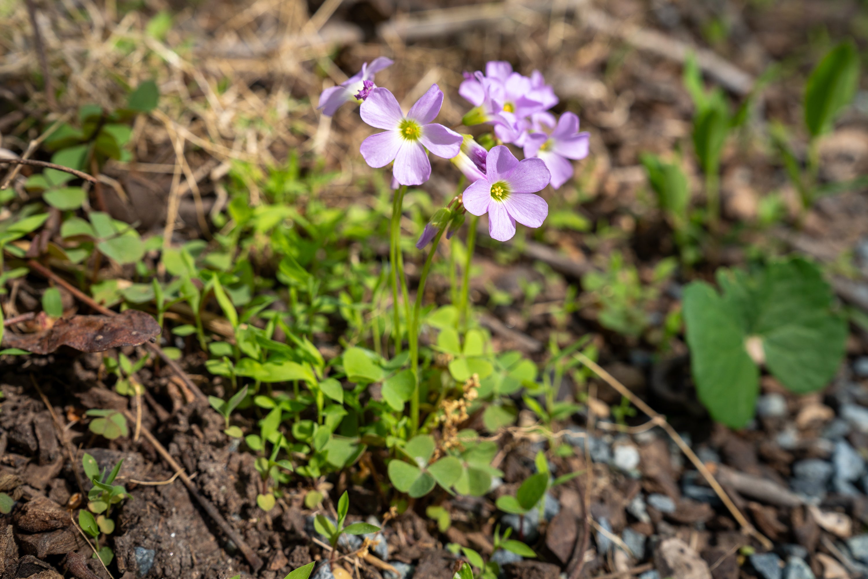The only wood-sorrel in Maryland to have a purple bloom, the violet wood-sorrel (Oxalis violacea) can be spotted blooming along the Woodland Trail in April, sometimes into May. The plant is pollinated by bees and is native to eastern North America. With shamrock-like leaves growing close to the ground, the violet wood-sorrel only reaches heights of about six inches when in bloom. The plant has a tendency to cluster in open spots in damp woods (at Glenstone it colonizes a slope between Andy Goldsworthy’s Clay Houses (Boulder-Room-Holes), 2007, and Simone Leigh’s Satellite, 2022.